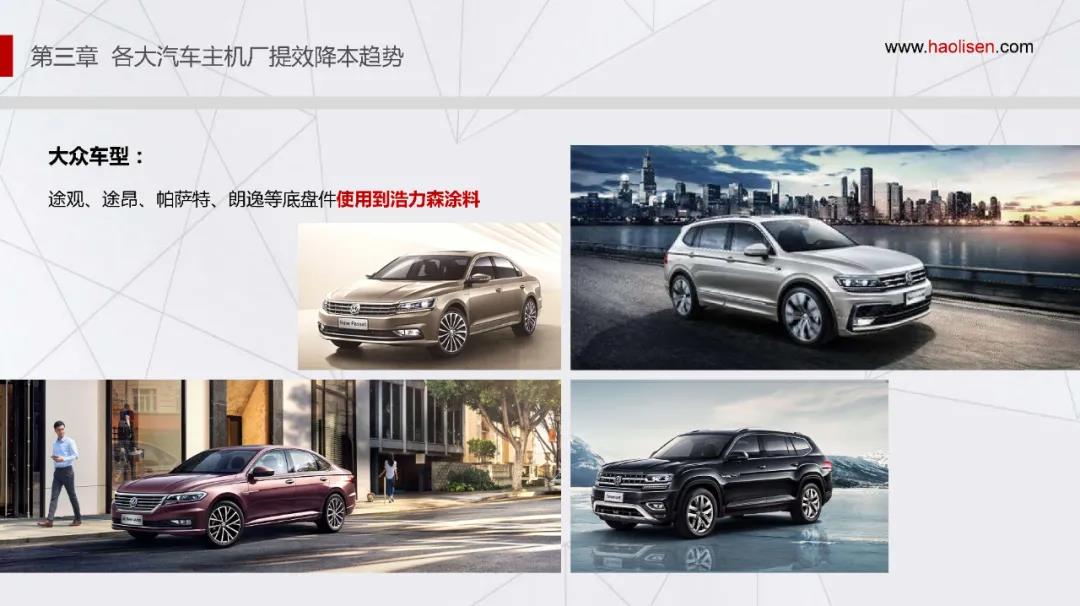 自2020年起, HLS-17系列產(chǎn)品就供應(yīng)于上海匯眾汽車制造有限公司,成為當(dāng)時(shí)全球范圍內(nèi)為上汽合資品牌乘用車供應(yīng)底盤件電泳漆僅有的三家供應(yīng)商之一,且是其中唯一一家亞洲企業(yè)。途觀、途昂、帕薩特、朗逸等熱銷車型的底盤件都使用到該產(chǎn)品。并且,隨著匯眾汽車底盤件的出口,HLS-17系列產(chǎn)品也遠(yuǎn)銷海外。