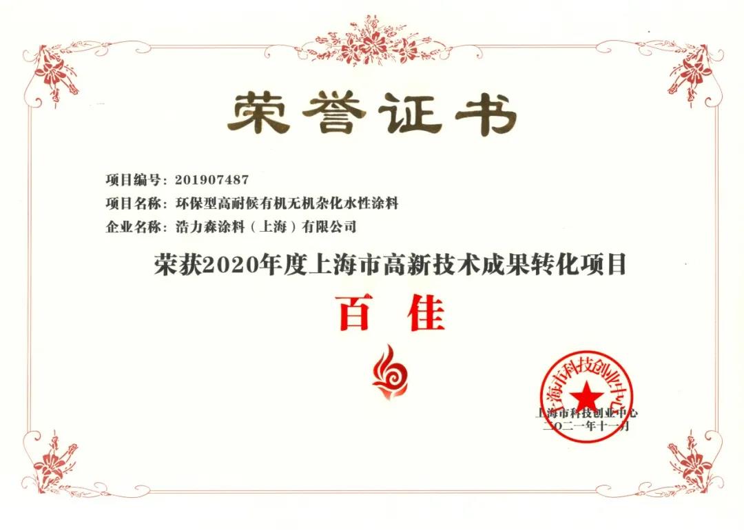 憑借“環(huán)保型高耐候有機無機雜化水性涂料”項目浩力森榮獲2020年度上海市高新技術成果轉化項目百佳。值得一提的是這已是浩力森第三次獲得該項榮譽。