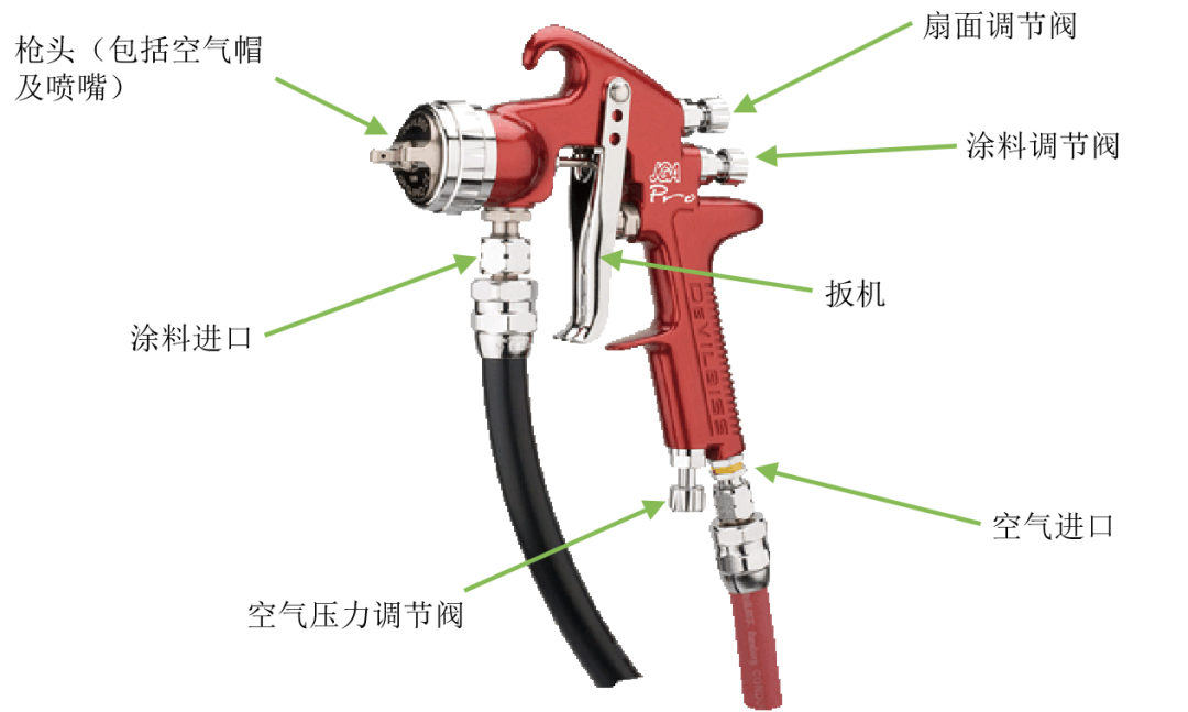 上圖為壓送式噴槍是從另設(shè)的涂料增壓罐供給涂料,提高增壓罐的壓力可同時向幾只噴槍供給涂料,這種噴槍的涂料槍嘴與空氣帽心孔位于同一平面,或較空氣帽中心孔向內(nèi)稍凹,在涂料噴嘴前端不必形成負(fù)壓。壓送式噴槍適用于涂料用良多且連續(xù)噴涂的作業(yè)場合。