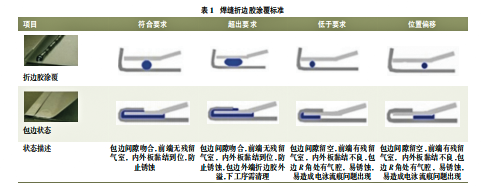 3)拆解車折邊膠狀態(tài):現(xiàn)場:查拆解車折邊膠狀態(tài),折邊膠僅在內(nèi)外板內(nèi)側(cè),包邊及R角處無膠。標準:如圖表1所列。