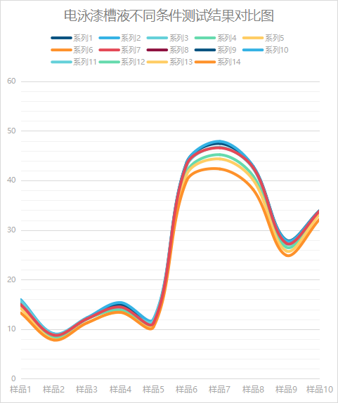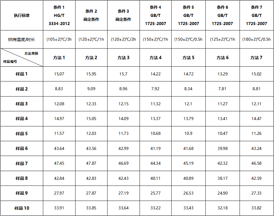 固體份含量太低時(shí),有可能會(huì)導(dǎo)致漆膜偏薄、泳透率下降,涂層質(zhì)量的穩(wěn)定性下降。而固體份含量太高時(shí),則有可能會(huì)導(dǎo)致電泳漆膜產(chǎn)生"桔皮"現(xiàn)象,且出現(xiàn)帶出損耗增加。因此對(duì)電泳槽液固體份含量的控制,是電泳生產(chǎn)線重要的管控指標(biāo)。 GB/T 6751-1986(目前作廢) GB/T 1725-2007 1. 取潔凈、干燥鋁制表面皿編號(hào),在分析天平上準(zhǔn)確稱量其質(zhì)量M1。 2. 向表面皿中加入一定量的待測(cè)樣品,稱其質(zhì)量M2,放入電熱式鼓風(fēng)干燥箱內(nèi),120℃烘烤1h(當(dāng)溫度達(dá)到120℃時(shí)開(kāi)始計(jì)時(shí)),或商定溫度和條件。 3. 在干燥條件下冷卻稱重M3,按以下公式計(jì)算: 結(jié)果取兩次平行試驗(yàn)的平均值,平行測(cè)定的相對(duì)偏差應(yīng)不大于3%(或商定要求),若大于3%則需重新測(cè)試。 結(jié)合實(shí)驗(yàn)結(jié)果和電泳漆槽液不同條件測(cè)試結(jié)果對(duì)比圖可以看出: 1. 當(dāng)樣品和設(shè)備一致時(shí),烘烤溫度/時(shí)長(zhǎng)控制在(105±2)℃/ 3h、(120±2)℃/ 1h、(120±2)℃/ 2h、(180±2)℃/0.5h各數(shù)值之間的偏差較?。ㄒ詶l件2數(shù)據(jù)為基準(zhǔn),相對(duì)偏差在7%以內(nèi)),對(duì)電泳涂裝生產(chǎn)線槽液指標(biāo)管控來(lái)說(shuō),以上數(shù)據(jù)均可作為有效數(shù)據(jù)用于日常生產(chǎn)線固體份參數(shù)調(diào)整;若時(shí)間受限制可使用(180±2)℃/0.5h來(lái)替代(120±2)℃/ 1h條件來(lái)測(cè)試。 2. 當(dāng)烘烤溫度/時(shí)長(zhǎng)控制在(150±2)℃/ 1h、(150±2)℃/ 0.5h、(125±2)℃/ 1h各數(shù)值之間的偏差較大(以條件2數(shù)據(jù)為基準(zhǔn)),總體數(shù)據(jù)較其他條件測(cè)試明顯偏差較大,不建議用于電泳生產(chǎn)線固體份日常維護(hù)數(shù)據(jù)參考條件。 3. 當(dāng)烘烤溫度/時(shí)長(zhǎng)控制在(150±2)℃/ 1h、(150±2)℃/ 0.5h各數(shù)值之間的偏差較?。ㄒ詶l件4數(shù)據(jù)為基準(zhǔn),相對(duì)偏差在7%以內(nèi)),如需要按照此條件來(lái)測(cè)試,兩者皆可使用。