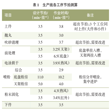 整改措施:1)針對換粉發(fā)現(xiàn)的影響節(jié)拍問題,通過與技術(shù)工藝人員現(xiàn)場試驗并分析,結(jié)合噴粉供粉系統(tǒng)及輸送特點,指定了可視化的換粉操作步驟,同時形成標準作業(yè),對員工進行培訓,減少了因換粉導致的節(jié)拍浪費,由原來1.5 h降低到目前的0.5h。2)由于在換粉過程中,此粉房屬于停線狀態(tài),因生產(chǎn)線為大小兩個粉房,通過對每個粉房的操作節(jié)拍進行測算兩個粉房的生節(jié)拍分別為10.5 min/掛、4.0min掛,為保證整體節(jié)拍滿足3.5min,可通過排產(chǎn)時將上線計劃進行調(diào)整,將特殊顏色產(chǎn)品單獨進一個粉房,在特殊顏色中間穿插6掛正常顏色,在特殊顏色進行換色時,將特殊顏色工件倒入換粉粉房前貯存區(qū),給后續(xù)正常顏色工件騰出輸送路線,數(shù)量根據(jù)粉房前貯存區(qū)大小確定,這樣可實現(xiàn)正常顏色在換粉的0.5 h內(nèi)繼續(xù)轉(zhuǎn)移至另外一個粉房,實現(xiàn)粉房的正常運行,從而保證整體節(jié)拍依然能夠滿足整體產(chǎn)線節(jié)拍要求。