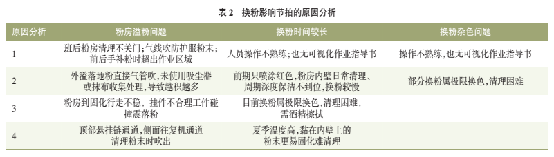 現(xiàn)狀分析:噴粉工位在測算標準作業(yè)時間時,主要在換粉時超出作業(yè)時間,因噴粉工位為大小兩個噴粉室,在顏色更換時需要對集中供粉及噴粉室內(nèi)部進行清理,同時噴粉室周邊有少量溢粉,定期清理耽誤節(jié)拍時間,具體原因分析見表2。