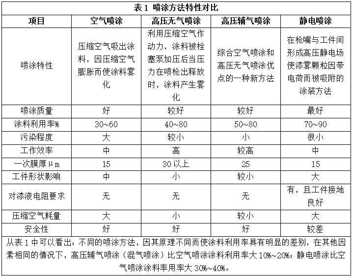 空氣噴涂法是最簡(jiǎn)單最基本的噴涂方法,也是目前廣泛使用的噴涂方法,其主要原理是利用壓縮空氣(氣壓在0.3~0.5Mpa)流經(jīng)噴嘴時(shí),使其周圍產(chǎn)生負(fù)壓而使漆液被吸出,因壓縮空氣的快速擴(kuò)散而霧化。其噴涂利用率低在所有與噴涂方法中最低,一般在30%~60%范圍內(nèi),且環(huán)境污染最嚴(yán)重。使用空氣噴涂法,相當(dāng)一部分涂料是在噴涂時(shí)因霧化、飛散而浪費(fèi)。這不但增加制造成本,而且還加重了噴漆房?jī)?nèi)過濾棉的堵塞,污染了環(huán)境和設(shè)備。要提高涂料的利用率,必須從涂裝方法、涂裝工藝和涂裝管理入手,實(shí)行全過程控制,才能取得良好的效果。 1.噴涂方法的影響 對(duì)空氣噴涂法,高壓無(wú)氣噴涂法,高壓輔氣噴涂法(又稱混氣噴涂法)和靜電噴涂法等噴涂方式進(jìn)行對(duì)比分析,結(jié)果如表1。 . 2.操作技能的影響 噴漆工的操作技能影響著噴涂的全過程;在噴涂前,表現(xiàn)在操作者對(duì)涂料的調(diào)配,對(duì)噴槍各旋鈕的調(diào)整,如漆量調(diào)控閥、空氣調(diào)節(jié)閥和扇形調(diào)控閥等;在噴涂時(shí),表現(xiàn)在噴槍與工件的距離,走槍的速度、勻速性及前后噴涂搭接的掌握;在噴涂后,表現(xiàn)在對(duì)噴槍的及時(shí)清洗和維護(hù)保養(yǎng)。氣壓一般控制在0.5Mpa左右、出漆量控制在200ml/min左右、走槍速度控制在300~450mm/s、噴幅控制在150mm左右、噴涂距離控制在200~250mm、前后噴幅搭接1/3左右較為理想。能否掌握這些技能,將直接影響涂料的利用率和噴槍的使用壽命。 目前許多公司噴漆工操作技能偏低,主要有2個(gè)方面的原因: (1)一些公司的涂裝工藝各個(gè)工序以產(chǎn)品為單位集中化,實(shí)施“一人多能”的生產(chǎn)模式,大大降低了噴涂作業(yè)專業(yè)化程度; (2)噴漆工種臟、累、有毒有害,很多人不愿意從事該工種,或從事之后卻又改做其他工種?;谏鲜鲈颍斐蓢娖峁ぜ夹g(shù)素質(zhì)不高,對(duì)噴涂操作技能掌握不夠,導(dǎo)致漆霧過分飛散,且經(jīng)常因漏噴、流掛、漆膜厚度過分不均勻而造成返工,加上操作人員節(jié)約意識(shí)淡漠,大大降低了涂料的率用率。 3.涂裝場(chǎng)地分散的影響某公司涂料年用量達(dá)30T以上,但由于分散在3個(gè)點(diǎn)涂裝作業(yè),一次性噴涂作業(yè)批量小,降低了涂料的利用率。因?yàn)槊看螄娡孔鳂I(yè),損耗在輸漆管、漆桶和噴槍中的涂料是一定的。一次性作業(yè)批量越少,需作業(yè)的次數(shù)就越多,所以浪費(fèi)的就越多。此外,涂裝場(chǎng)地分散還影響了一些新型高利用率涂裝方法的推廣應(yīng)用。 4.其他因素影響噴漆房?jī)?nèi)的風(fēng)速對(duì)涂料的利用率有影響,涂料利用率最大時(shí)的風(fēng)速范圍為0.3~0.5m/s,從實(shí)測(cè)的情況看,噴漆房?jī)?nèi)風(fēng)速大多在0.3m/s左右,因此影響較小。此外,所使用的涂料種類、工件的形狀和大小對(duì)涂料的利用率也有一定的影響。 1.改進(jìn)噴涂方法 其實(shí)就是改進(jìn)噴槍及其附屬設(shè)施。為確保產(chǎn)品質(zhì)量,經(jīng)試驗(yàn),采用高壓輔氣噴槍(混氣噴槍)替代現(xiàn)行的空氣噴槍噴底漆;靜電噴槍替代現(xiàn)行的空氣噴槍噴面漆,在其他因素相同的情況下,不但涂料的利用率可提高20%以上,提升了面漆的質(zhì)量,且漆霧、粉塵和壓縮空氣用量明顯減少,從而達(dá)到經(jīng)濟(jì)效益和環(huán)境效益雙豐收。此外,用高壓輔氣噴槍不但可提高涂料利用率,還可提高工作效率,但在操作過程需注意以下幾點(diǎn): (1)結(jié)束時(shí)間相對(duì)增加,因采用高壓漆桶,高壓漆管輸送漆液,準(zhǔn)備,結(jié)束時(shí)間相對(duì)增加,一般在20min左右。但對(duì)于高壓輔氣噴槍,因其工作效率為空氣噴槍的1.5倍,一次噴涂時(shí)間1h以上,即噴涂12kg以上的涂料,便可節(jié)約20min左右噴漆時(shí)間; (2)輸漆管中所剩涂料的處理, 每次洗時(shí)管道中所剩的涂料(0.5kg左右)和所用稀釋劑較多,應(yīng)盡可能連續(xù)作業(yè),即盡可能大批量作業(yè)時(shí)使用,減少清洗次數(shù)。在實(shí)際操作中,也可通過及時(shí)添加稀釋劑,把管道中涂料噴完,稀釋劑經(jīng)過濾后可重復(fù)使用; (3)靜電噴槍對(duì)漆液的電阻值有一定的范圍要求,且工件接地良好:漆液的電阻值主要通過稀釋劑來調(diào)整,接地是通過吊鉤或?qū)S媒拥鼐€來實(shí)現(xiàn),但這兩者好與壞,均可從漆霧的吸附情況來判斷,因此能及時(shí)發(fā)現(xiàn)問題。一般20d左右需清理一次吊鉤或接地線; (4)一般溶劑型靜電噴槍,大都采用外接電源的方式,所以靜電噴涂存在火災(zāi)隱患。 2.改進(jìn)涂裝工藝為充分發(fā)揮高壓輔氣噴槍(混氣槍)或靜電噴槍涂料利用率高的特性,能否提高一次性噴涂作業(yè)批量,是應(yīng)用成功與否的關(guān)鍵。而對(duì)“涂裝作業(yè)點(diǎn)”實(shí)施相對(duì)集中,實(shí)行“涂裝作業(yè)”專業(yè)化,是提高噴涂作業(yè)批量的有效方法。 3.規(guī)范涂裝管理要從根本上提高涂料的利用率,必須建立規(guī)范的管理措施,認(rèn)真做好以下幾個(gè)方面: (1)加強(qiáng)噴漆操作員工培訓(xùn),提高其操作技能,應(yīng)及時(shí)從職業(yè)學(xué)院引進(jìn)涂裝專業(yè)的畢業(yè)生,提高操作人員的整體素質(zhì)。通過競(jìng)聘的方法確定