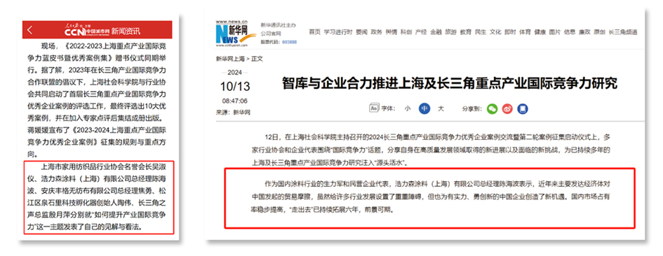 近日,浩力森受邀參加了由上海市商務(wù)委員會支持、上海社會科學(xué)院主辦的2024長三角重點產(chǎn)業(yè)國際競爭力優(yōu)秀企業(yè)案例交流暨第二輪案例征集啟動儀式。 . 據(jù)悉,2023年,在長三角產(chǎn)業(yè)國際競爭力合作聯(lián)盟的倡議下,上海社會科學(xué)院與行業(yè)協(xié)會共同評選出了首屆長三角重點產(chǎn)業(yè)國際競爭力優(yōu)秀企業(yè)案例,共有10大案例脫穎而出,并在加入專家點評后集結(jié)成書。同時,會上還公布了《2023-2024上海重點產(chǎn)業(yè)國際競爭力優(yōu)秀企業(yè)案例》的征集規(guī)則與重點方向。 人民日報 / 新華網(wǎng) 此次會議吸引了包括人民日報、新華網(wǎng)、文匯報、解放日報在內(nèi)的眾多國家級主流媒體的高度關(guān)注與廣泛報道。 作為國內(nèi)涂料行業(yè)的生力軍和民營企業(yè)代表,浩力森的代表在會上衷心感謝上?;ば袠I(yè)協(xié)會的活動邀請,并進一步指出,近年來,主要發(fā)達經(jīng)濟體對中國發(fā)起的貿(mào)易摩擦確實給行業(yè)發(fā)展帶來了不少挑戰(zhàn),但同時也為那些有實力、勇于創(chuàng)新的中國企業(yè)帶來了新的機遇。 . 浩力森憑借自身的實力和創(chuàng)新精神,在國內(nèi)市場的占有率穩(wěn)步提高,同時,“走出去”戰(zhàn)略也已持續(xù)實施了六年,前景十分廣闊。